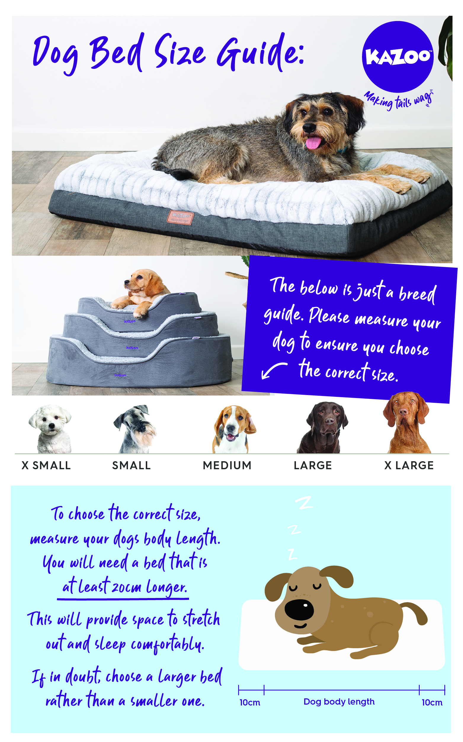Dog Bed Size GuideUpdated 5 hours agoWhen it comes to choosing a dog bed, we recommend measuring your dog from nose to tail. Then, allow an extra 20 centimetres to give your dog room to stretch, roll over or put their favourite toy. Was this article helpful? YesNo